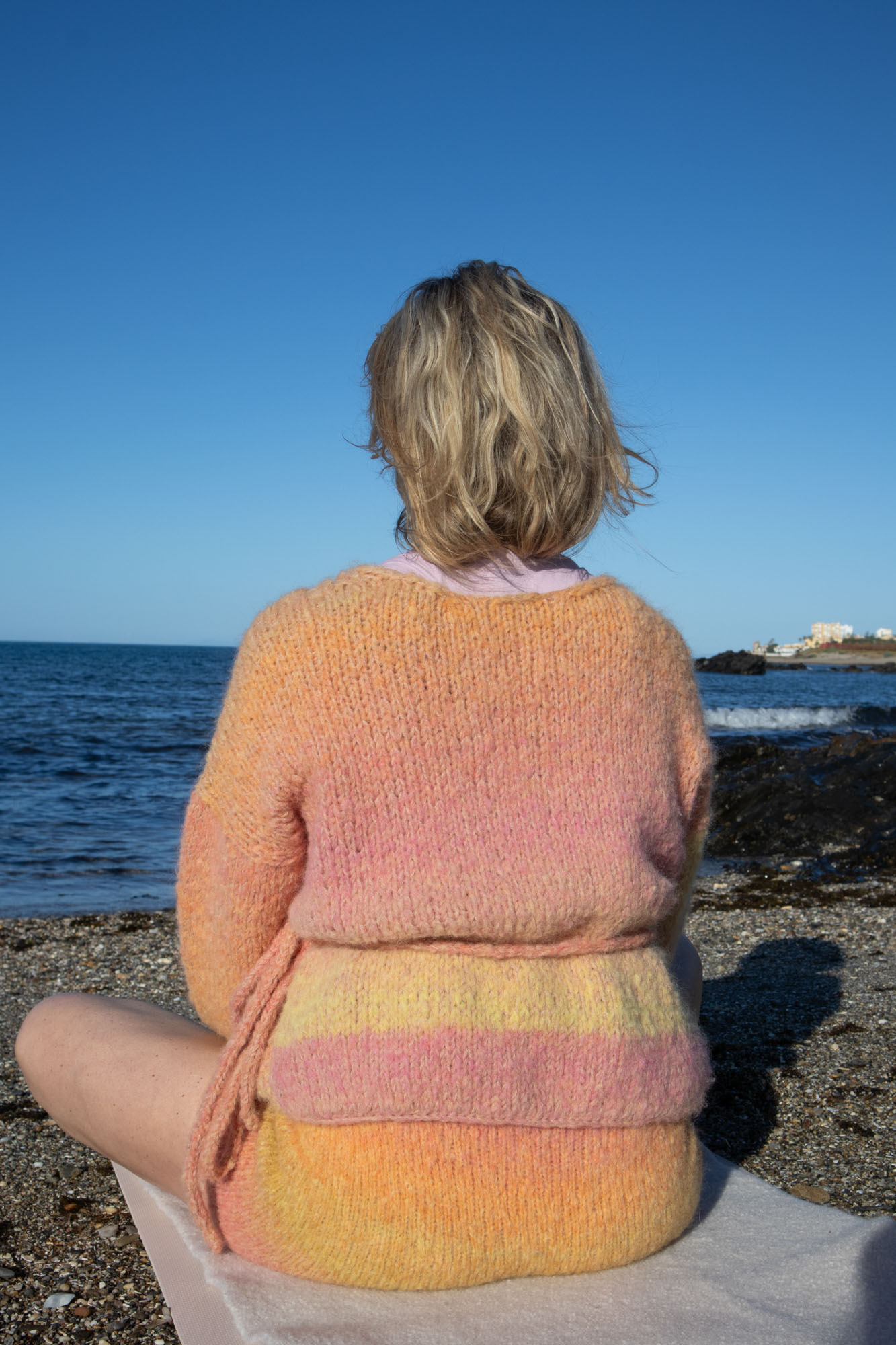 12 m x 16 omganger glattstrikk med 1 tråd i hver kvalitet på p nr 7 = 10 x 10 cm