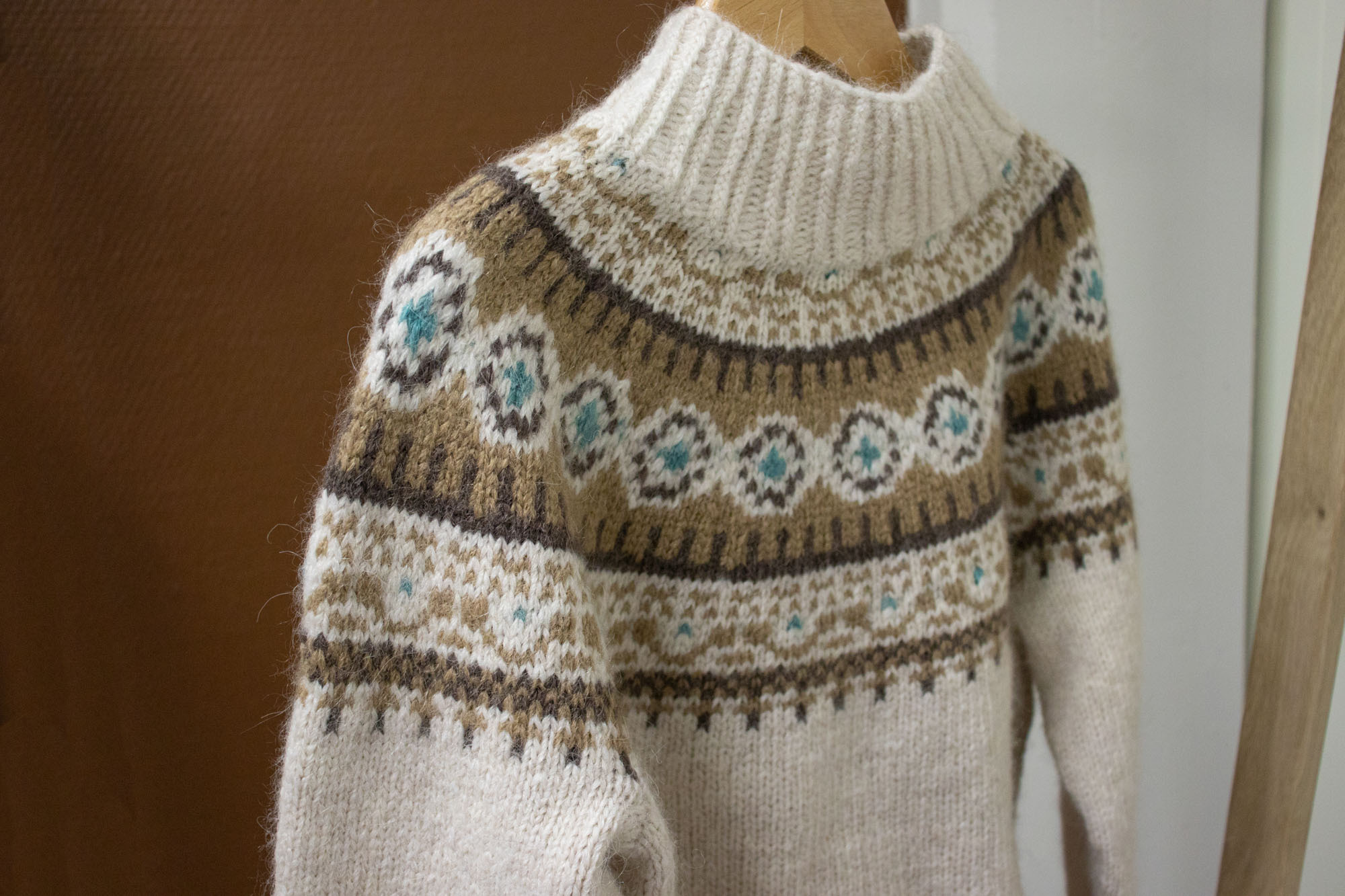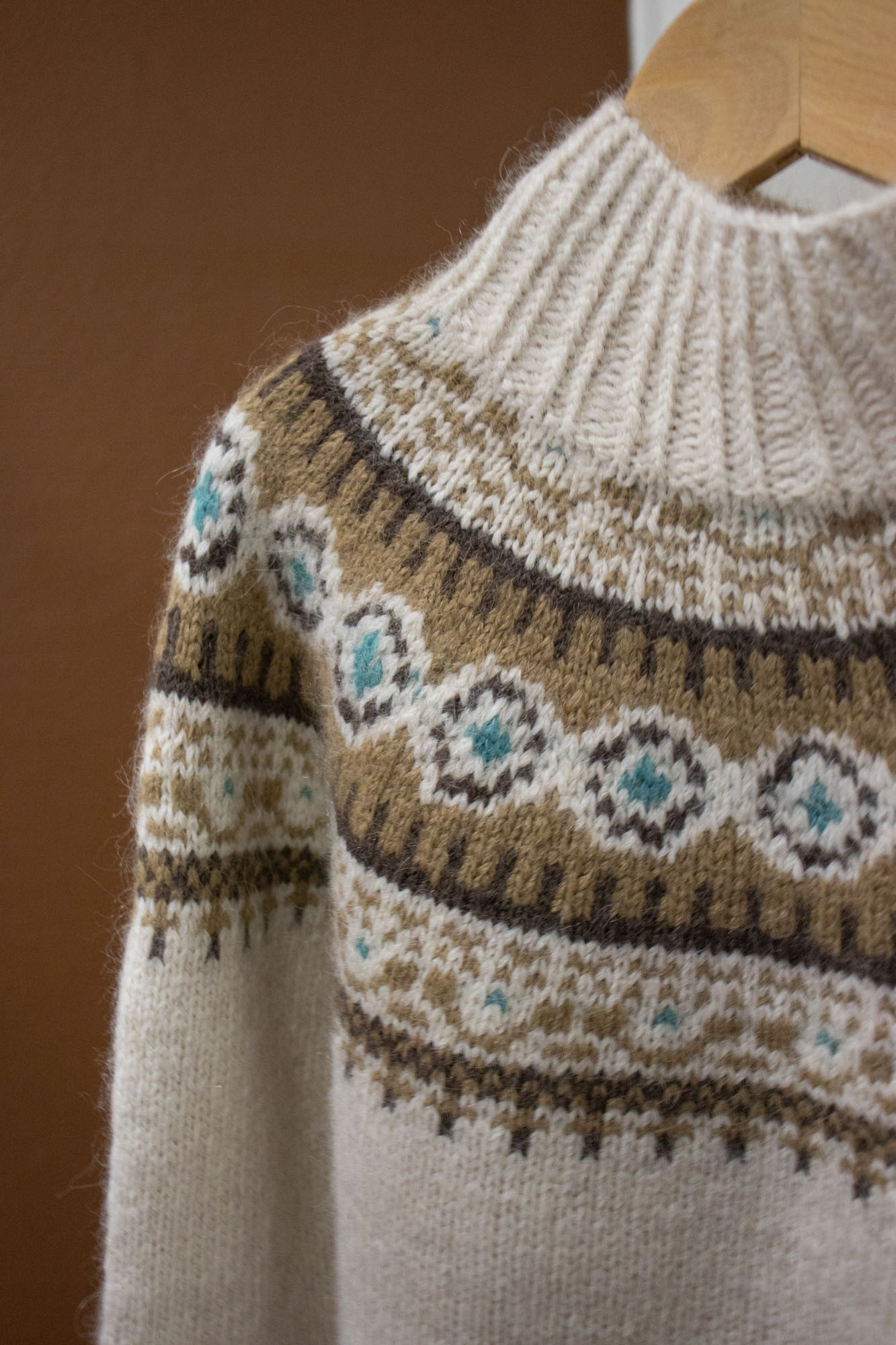 18 m og 22 omganger glattstrikk og mønster på p nr 5 = 10 x 10 cm