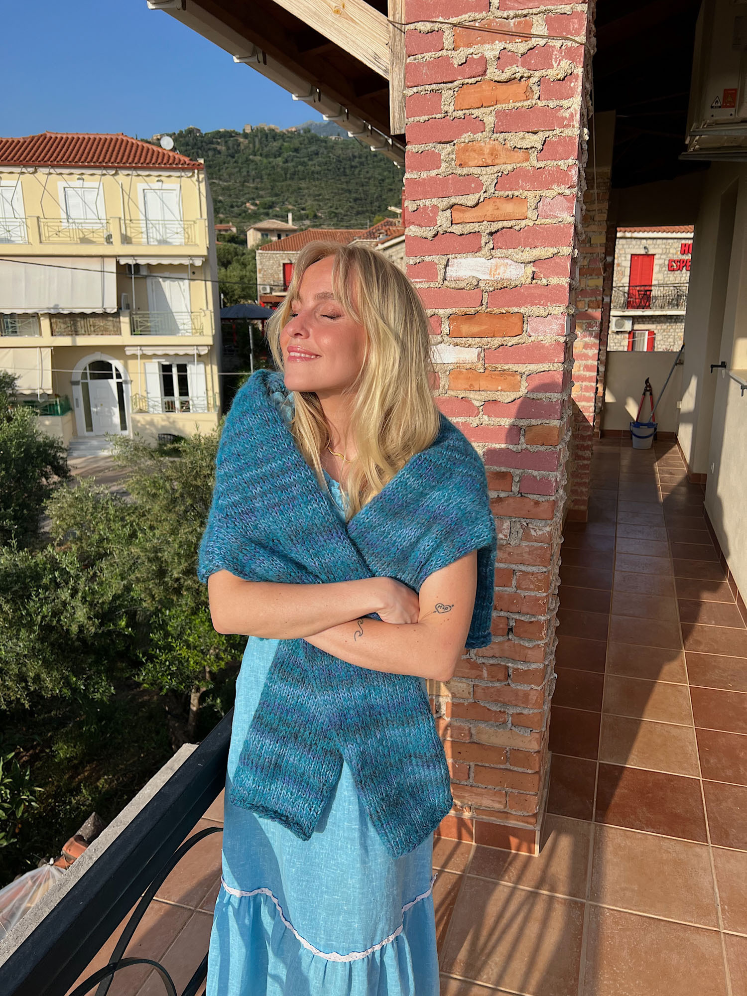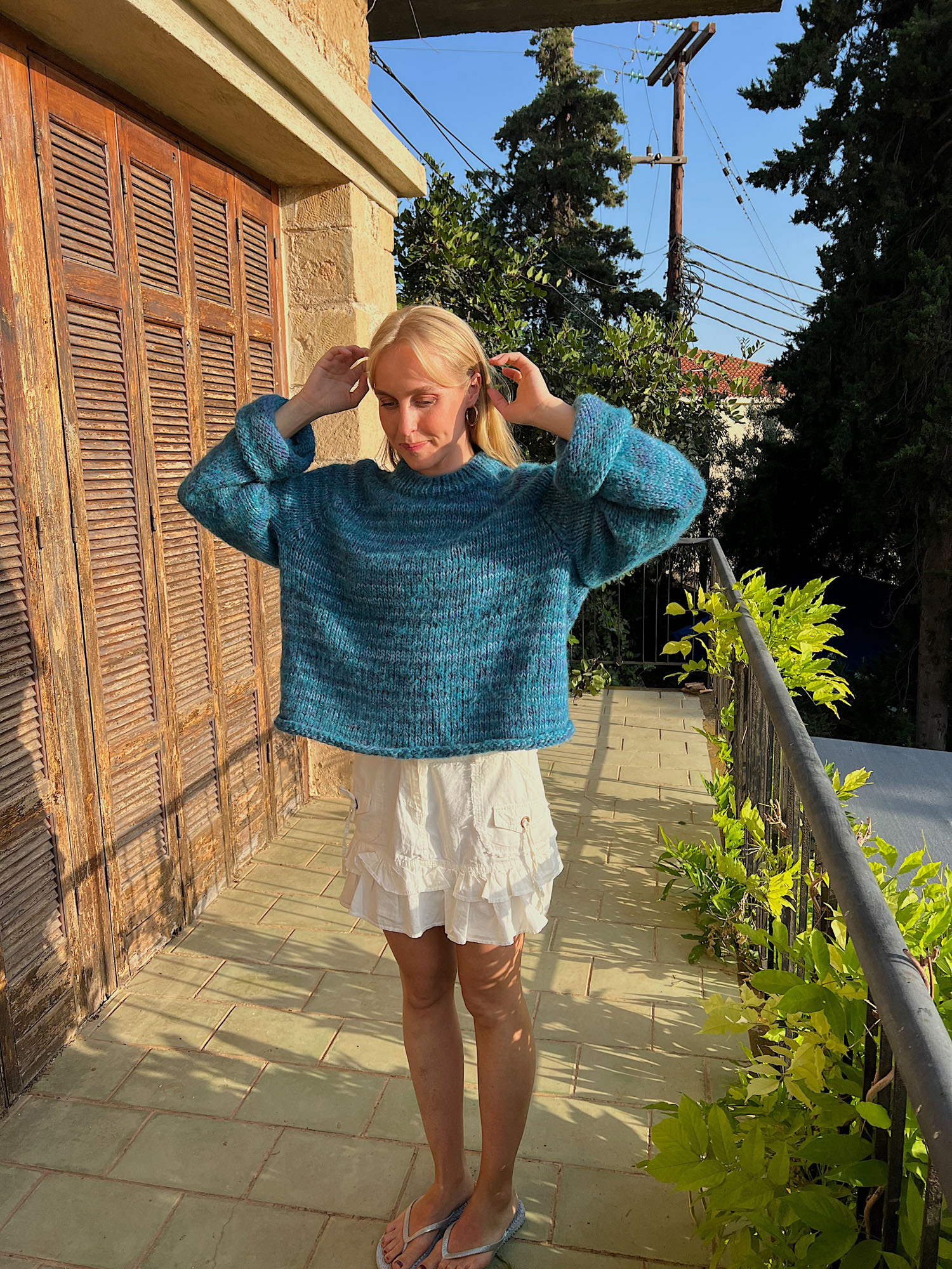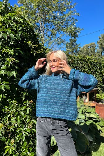 11 m x 15 p/omganger glattstrikk med dobbelt garn (1 tråd av hver kvalitet) på p nr 8 = 10 x 10 cm